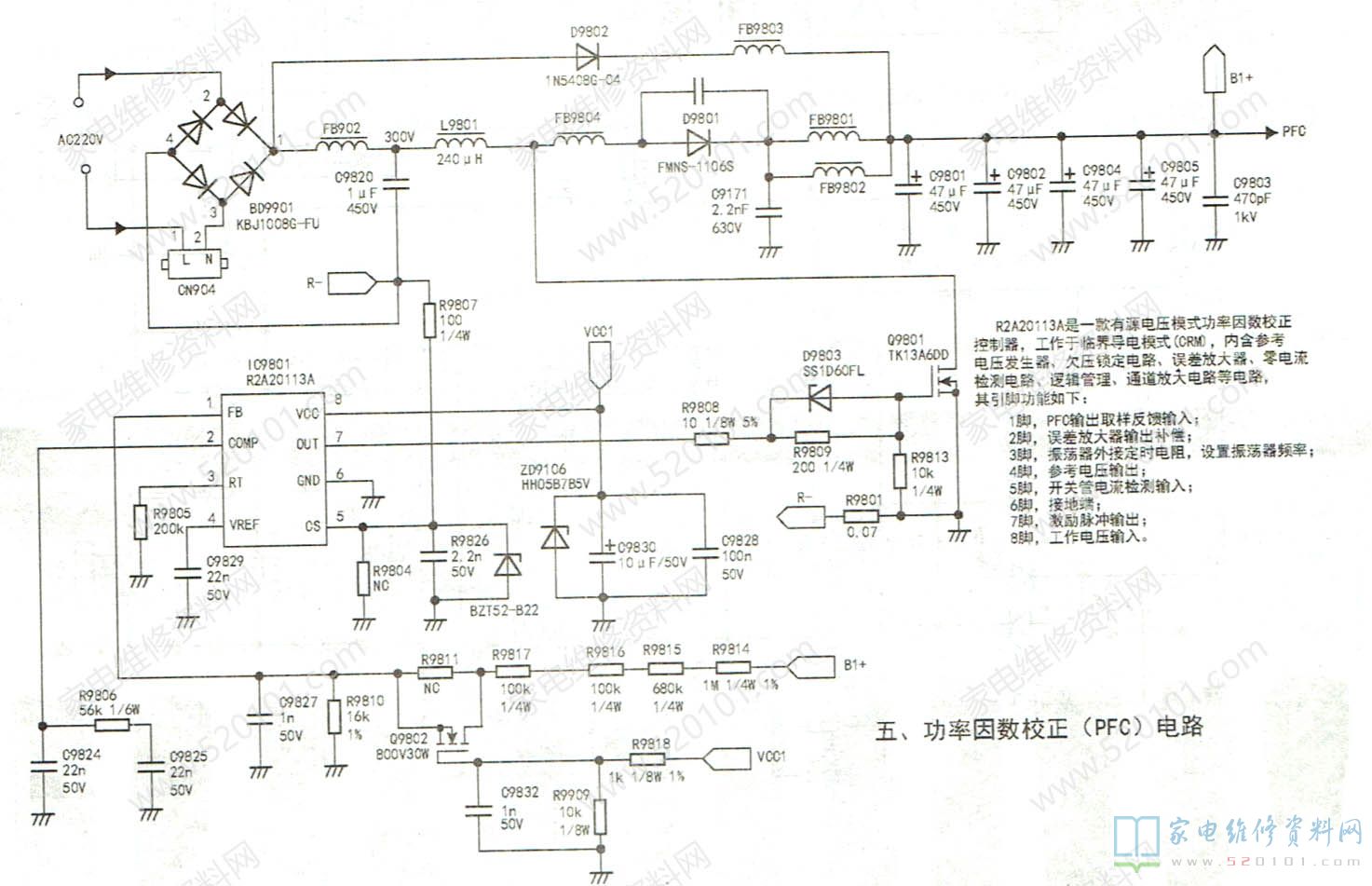 该型电源背光二合一板以集成块R2A20113A (IC9801) 为核心组成PFC (功率因数校正)电路,将整流滤波后的市电提升到+380V,为主、副开关电源供电;以集成块