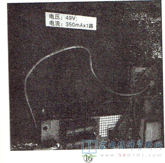 LED驱动板假负载电阻的选取原则是流过电阻的电流与LED灯串的电流相近,例如:京东方HV320WX2-201型LED液晶屏,其LED灯条的参数如图16所示,即该型LED灯串,且额定电压是49V,额定电流是350mA,其对应的假负载电阻的阻值应与140Ω (49V/350mA )接近。