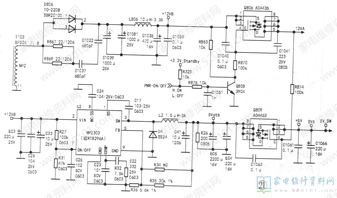 例2:一台海尔LE32B50彩电(6M182机芯),不开机,但在开机时屏幕会闪一下。分析检修:试机,发现背光亮一下就熄。 拆机检查,发现该机采用电源、背光驱动、信号处理三合一板。通电后电源电路输出+12VB电压,经DC-DC降压芯片MP2303(或RT8296A )变换后输出5Vsb电压,如图21所示。