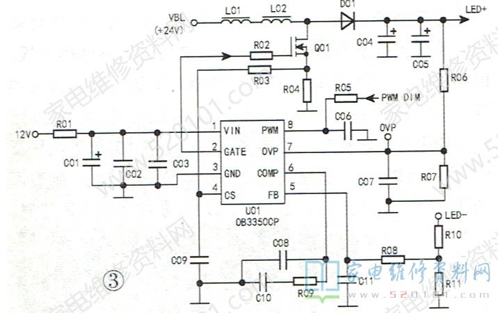 RO6、 R07、C07组成过压取样电路。U01 的⑦脚为过压保护端,门限电压为2.0V,当OVP值达到2.0V时,无驱动脉冲输出。UO1的④脚为过流保护端,以防止升压电感失效或QB801导通失控过流损坏。UO1 的⑤脚为LED电流设置端,可通过调节外接分压电阻R10、R11的阻值来设置流过LED灯条的电流。