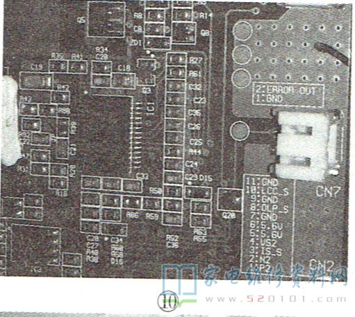 值得注意的是,大多数液晶彩电的背光驱动电路不输出信号反馈给主板,但部分新型液晶彩电(尤其是进口机型)的背光驱动电路会输出一个状态检测信号送给主板,以便CPU判断背光驱动板的工作状态。这个状态信号的英文标注多为ERROR、STAUS、STATUS等如图10所示。如果背光驱动板工作异常,则输出的状态信号电平反转,主板上的CPU据此会停止输出背光“开”信号,则表现的故障现象为背光亮一下就熄。 因此,在检修这类彩电时不能因主板无背光“开”信号输出而贸然判定主板有问题。