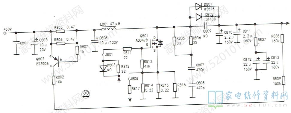 电感L801、高速整流管D801(MB515,耐压150V)、开关管Q801及滤波电容C810~C814等元件组成升压电路。R814~R817组成电流检测反馈电路。R813为Q801偏置电阻,为Q801的G极提供稳定的偏置电压。