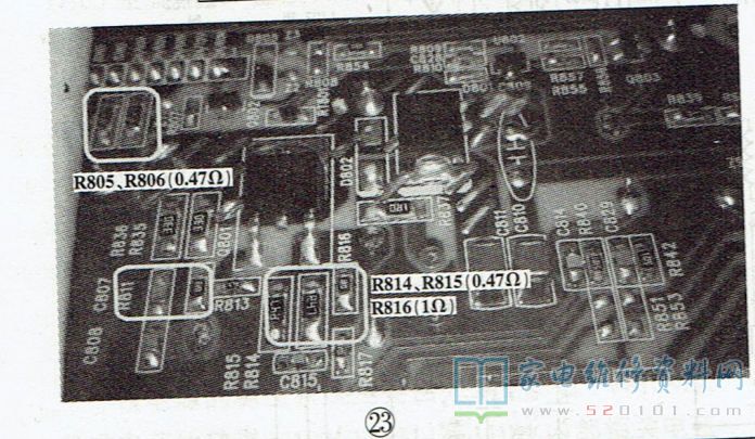 断电检测,发现背光供电电路中的过流检测电阻R805.R806已开路,这说明后级有短路故障。继续检测,发现开关管Q801已击穿,其s极外接电阻R814~R816已开路,如图23所示。