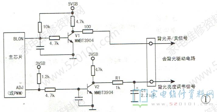 背光驱动板要正常工作除需正常的供电外,还需主板为其提供一个背光“开”信号(英文标注常为BLON,ON/OFFENA等),部分背光驱动电路(主要是IP板与LED 背光驱动板)还需亮度调节信号(又称调光信号,英文标注常为ADJ、DIM、PWM等)。在常见的电路中,主芯片的BLON及ADJ端分别输出背光“开”信号及背光亮度调节信号,经一级倒相电路后通过插座送往背光驱动电路,如图1所示。