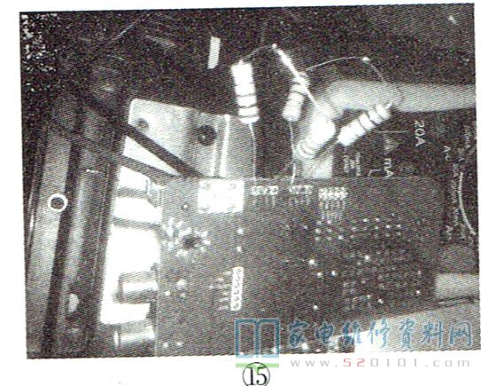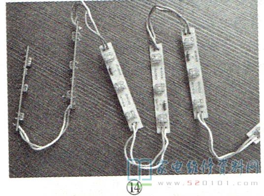 断开原机灯管或LED灯条,在背光驱动输出端接假负载试机。对于LED液晶彩电而言,假负载可以是LED灯串,如图14所示,但灯串的工作电压与工作电流应尽可能与原机灯条一致,也可以用功率为3W~5W的电阻作假负载,如图15所示,但电阻 的阻值应合理选择,否则驱动电路会保护。