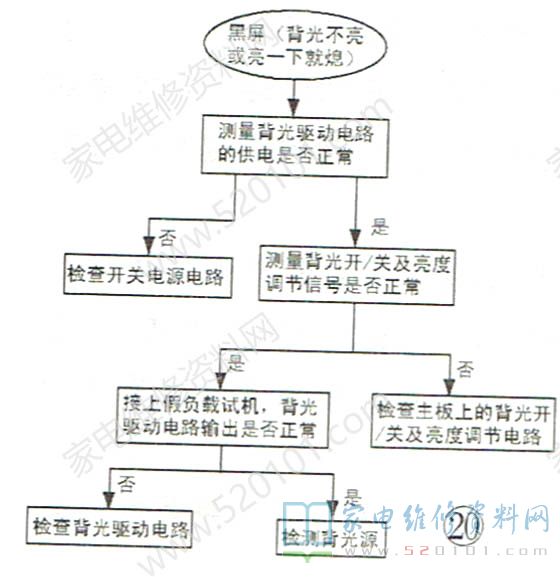 若在各个状态下都黑屏,且对相关硬件检查均正常,这时可试着进行软件升级。综上所述,黑屏故障的检修流程如图20所示。