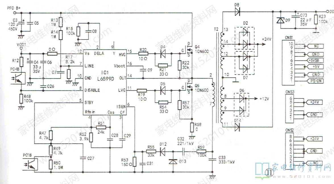 例1:一台长虹LT3212液晶彩电,在正常使用中突然关机,电源指示灯也不亮。分析检修:拆机检查,发现电源板(型号为FSP205-4E01)上的保险管F1(4A/250V)已发黑性熔断,这说明开关电源初级电路有严重短路现象。在路测量,发现除主电源开关管Q4、Q5击穿外,其他元件未见明显异常。更换保险F1及Q4、Q5后上电,测得插座CNS1的⑥脚输出5VSTB电压。将CNS1的①脚(PS-ON)与⑥脚短接(即强制开机)后上电,主开关电源无24V、12V电压输出,这说明主开关电源仍有问题,相关电路如图11所示。