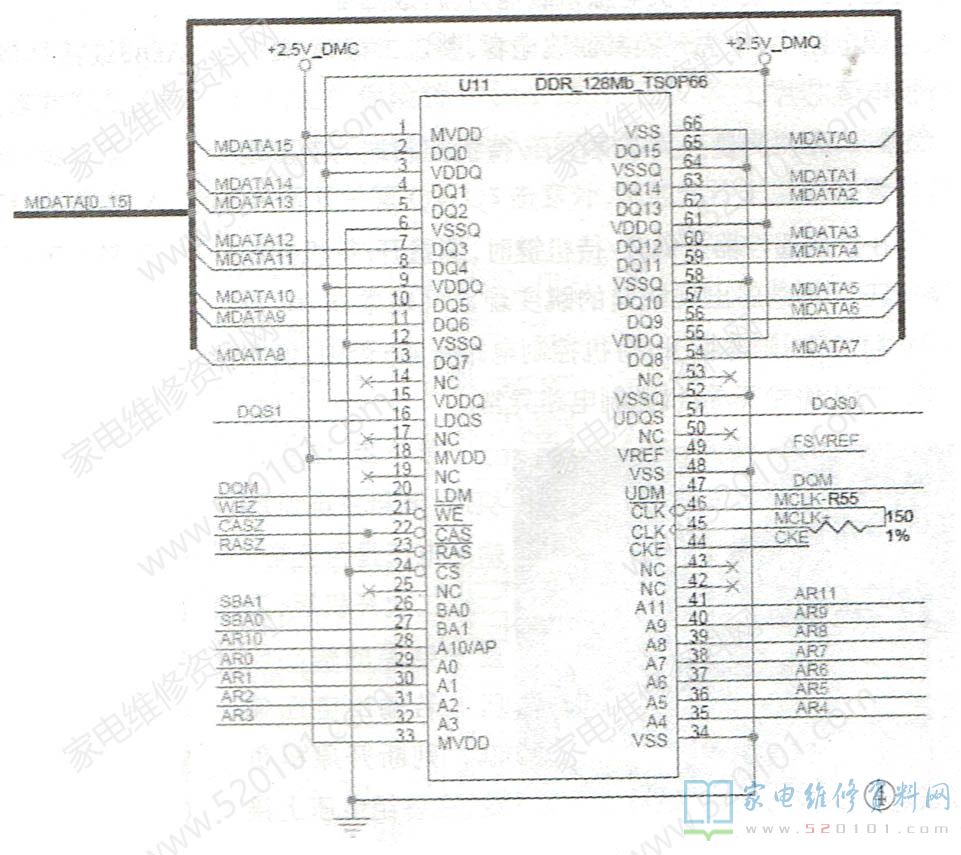 在液晶彩电中,图像解码电路在对各种输入信号进行数字化处理的过程中,有大量的中间信息需要进行暂时存储,以便随时调用。完成这个中间存储任务的就是DDR存储器。主芯片通过地址线数据线及一些控制信号线与DDR存储器建立通讯,进行数据的读出和写入。