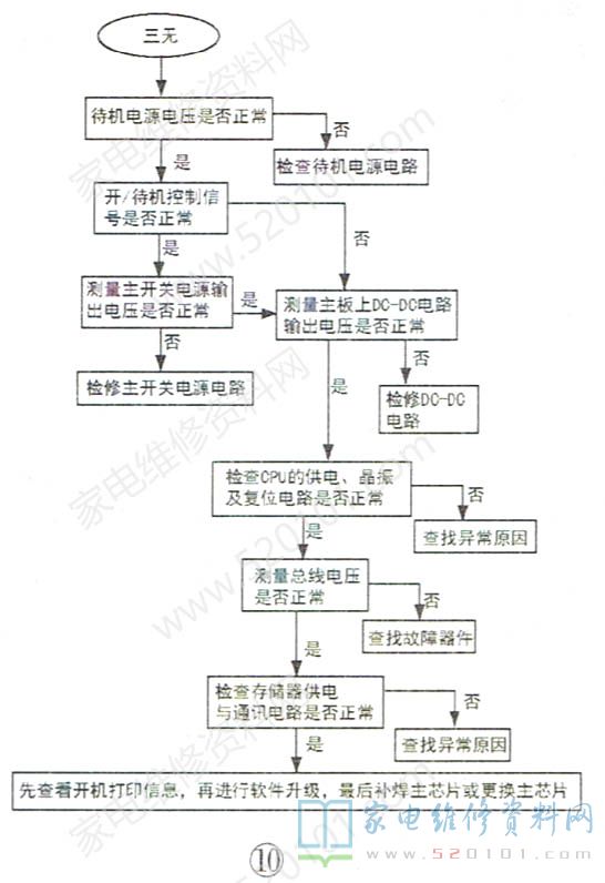 综上所述,液晶彩电三无故障的检修流程如图10所示。
