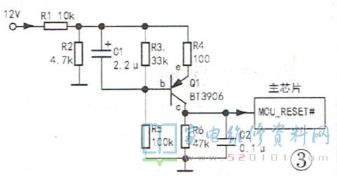 有的液晶彩电的CPU复位电路与普通CRT彩电一样,由复位三极管等元件组成,如图3所示。