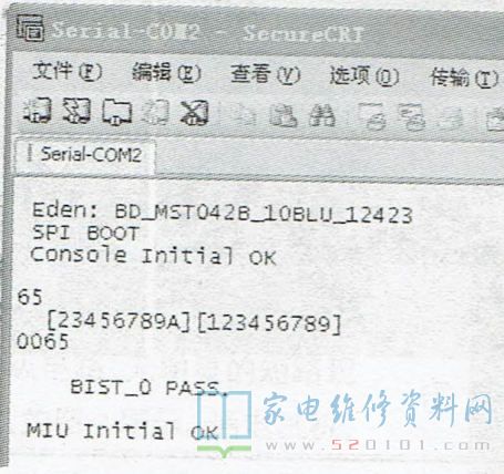 该机前面牌子标有“日立”的英文字母,客户说:此机之前故障是开机慢,最后就不开机了。在别的修理部检查过,说要换板,但买不到这种板子。拆开后盖,发现该机用的是三合一板(电源、信号处理、背光电路做在一块板上),板号是TP.MS3393.PD701 ,芯片采用MSD3393LU。通电检查,开关电源12V电压正常,但指示灯不亮,测MSD3393LU的1.2V、1.8V、3.3V供电均正常。MSD3393LU的59脚为PWR-ON/OFF端,按开/待机键时,该脚电压可在0V与3V之间跳变,说明CPU在工作,但不能二次开机。查看开机打印信息,如图1所示。分析打印信息,怀疑软件出了问题,需重写FLASH中的数据。由于找不到该机数据,也买不到同型的三合一板,考虑用三合一万能板代换。