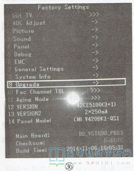 依次按遥控器上的节目源键及数字键2、5、8、0进入工厂菜单,如图36所示,选择第9项“Upgrade"进入下一页,按照第二行提示将U盘中的升级文件改名为“V69D_SN51_83.bin" ,然后将U盘插到电视机的USB接口中,在工厂菜单中进行升级操作,这时屏显升级进度条。升级结束后断电重启,图像正常,故障排除。再次进入工厂菜单,发现升级文件名称变为“V69D SN51_72.bin" ,如图37所示。
