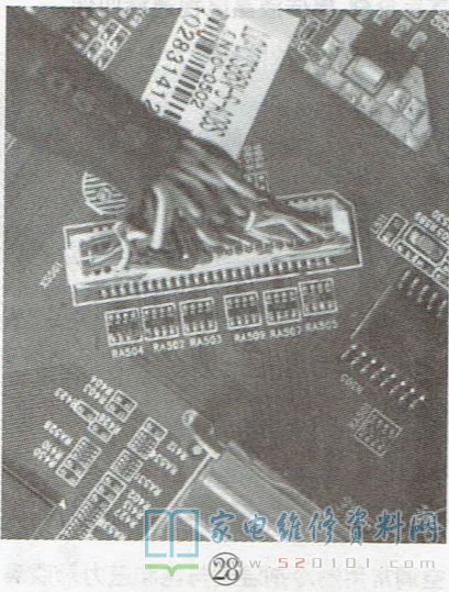 例1:一台康佳LC40TS86N彩电(MSD209+C2机芯),图像发黄。分析检修:该机开/关机、换台及声音正常,这说明主芯片工作正常,估计问题出在IVDS输出电路或逻辑板上。本着先易后难的原则先检查主板上的LVDS输出电路,如图28所示,对比测量该电路中排阻的在路阻值,发现排阻RA505中一只阳值接近4MΩ,明显异常,判断这只电阻已开路,换用一只220Ω的贴片电阻后试机,故障排除。
