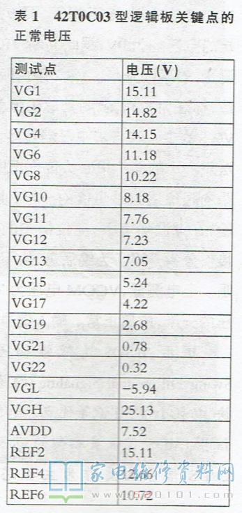 在试机过程中,手摸伽马校正芯片AS-15HF(U500)发热较快,且测得测试点vG1~VG21中有多个电压均为15V,这明显不对,怀疑AS-15HF损坏,换新后故障排除,此时测得该逻辑板上各关键点正常电压见表1,供参考。