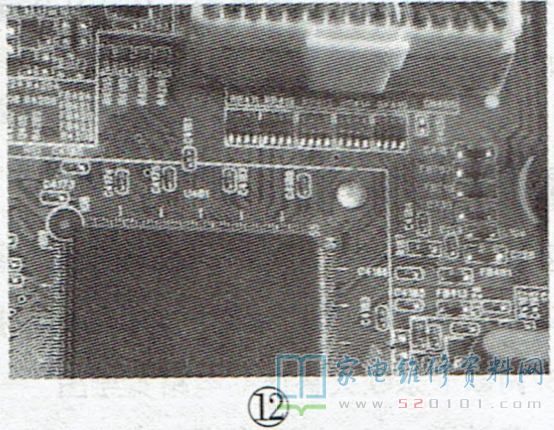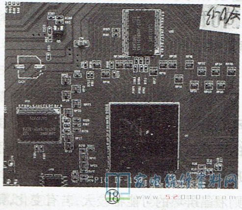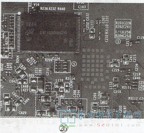 若怀疑花屏故障系解码或格式变换电路异常所致,先查看主芯片及DDR存储器的引脚有无虚焊现象,或用手轻压主芯片及DDR存储器,看花屏现象有无变化,若有变化,则表明引脚有虚焊现象,补焊即可;若无变化,补焊主芯片与DDR存储器之间的排阻,检查主芯片外接的供电滤波电容(多为贴片电容,有的位于印制板的另一面),如图26所示,最后代换晶振和主芯片一试。