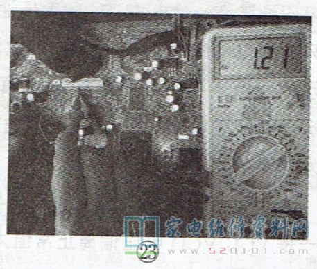第三步:测量LVDS信号端电压。用万用表测量主板或逻辑板上LVDS插座中各信号端的直流电压,正常时其值为1.2V左右,且每组信号线之间也有0.1V~0.3V 的电压差,如图23所示。若某路信号直流电压与1.2V相差较大,则重点检查该路信号传输电路中的排阻、电感等元件,也可先用洗板水清洗LVDS信号传输电路,然后用吹风机吹干再检查各元件引脚有无虚焊现象。