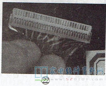 第二步:检查上屏线插头。实修此类故障时,不妨先按动或轻轻按动上屏线插头,看故障现象有无变化。另外,也可先拔下上屏线,观察其端头中的金属触点(俗称“金手指”)是否脏污,如图22所示。若金属触点有发黑现象,则用橡皮擦将触点擦拭干净,然后再插好即可。