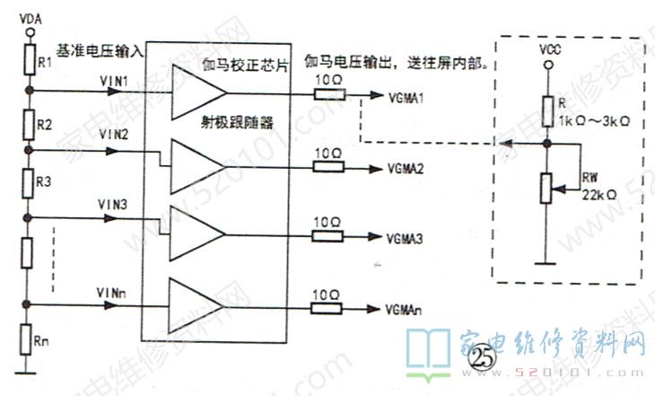 估计出伽马电压值后,则按图25中虚线框所示外接分压电路。若估计出的伽马电压值低于3V,则vCC取3.3V或5V,R取值1k;若估计出的伽马电压值高于3V,则vcC取12V或VDA,R取值3k、RW为可调电阻,在通电前应将RW连入电路的阻值调至0Ω或接近0Ω,通电后慢慢调大其阻值,直至该分压电路输出的电压接近估计出的咖马电压值,且图像也基本正常时为止,然后将RW换为同阻值固定电阻即可。