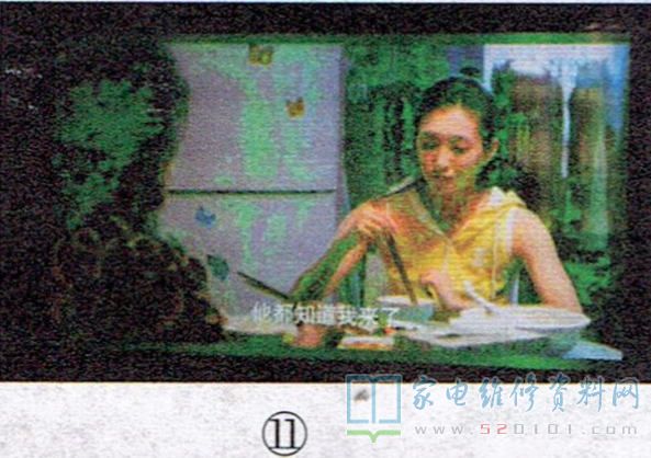 若上屏线插头(尤其是与逻辑板相连端的插头)与插座接触不良,易引起图像信号的缺失,从而出现竖条或花屏现象,且通常伴有图像偏红或偏绿现象,在图像背景较暗时尤为明显,如图11所示。