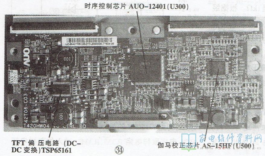 例4:一台海尔LB42R3彩电(6M69机芯),图像对比度差,且图像上有色块,如图33所示。分析检修:分析故障部位应在逻辑板的伽马电路中。该机液晶屏型号是T420HW04.V2,配套的逻辑板型号是42TOC03,如图34所示。