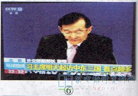 例5:一台海尔LE32Z50液晶彩电,图像发白,层次感不强,如图35所示。分析检修:据用户称,该机原接收有线电视信号图像正常,现转为连接机顶盒看电视时(AV输入)图像就发白,即使将图像模式置于“柔和"状态仍发白。该故障实为电视机图像模式数据设置不当所致,原因是该机使用AU屏,亮度较高。这时需通过工厂菜单对图像亮度、对比度、清晰度进行设置,具体方法如下:先按遥控器上的菜单键,在菜单字符未消失前,快速按数字键1、1、4、7进入工厂菜单,将图像模式中的亮度值与对比度值分别调为“13"和“121”即可。由于该机每个信号源通道的设置是独立的,因此需对TV.AV.HD-MI等信号源状态均作相应调整。