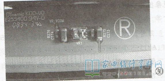 开机测量,R275两端和VR1上端电压均为14.9V,与VDD电压相等,而VR1下端和R276两端的电压均为0V ,据此判断VR1开路。拆下VR1测量,确实已开路。VR1采用陶瓷基板涂布碳膜制造,标注为“23”,表明其总阻值为2k。查看线路,VR1的中心端与其中一端短接,即为可调电阻的接法。VR1的动片中心头位于正中,表明VR1连入电路的阻值约为总阻值的一半,也就是1k。根据经验在潮湿环境下,电位器中的碳膜和金属脚的连接部分易开路。为绝后患,换下一只1k的贴片电阻。上电测量,VCOM电压为7.52V,约为VDD电压的一半应属正常。输入信号,图像正常。