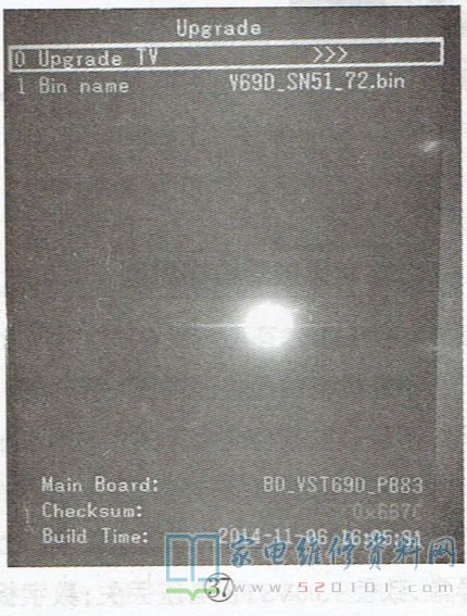 例6:一台三洋42CE5100液晶彩电(vSTV69D机芯),更换主板后图像花屏。分析检修:首先检查上屏线及连接情况,未发现异常,怀疑主板的软件数据不对。找来该机的升级软件,并按照厂家提供的操作方法(将升级文件名称改为“BIN_V69S.bin",拷贝到U盘根目录下,然后将U盘插到电视机USB接口中,断电重新通电)操作,但并未出现升级界面,电视机指示灯和U盘指示灯也不闪烁,升级失败。接下来尝试通过工厂模式升级。