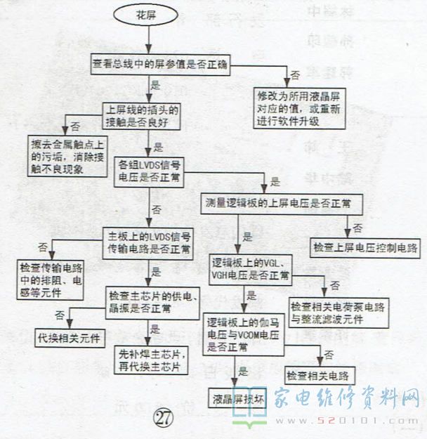 提示:在检修图像彩色镶边故障时,可先调节图像对比度值,若调大对比度值,图像彩色镶边更严重,甚至看不清图像;调小对比度值,彩色镶边现象减轻,图像基本正常,这说明主板无问题,问题出在逻辑板或液晶屏上。反之,故障出在主板上。综上所述,液晶彩电的花屏故障的检修流程如图27所示。