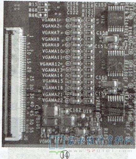提示:若DDR存储器与主芯片之间的数据线不通,一般表现为局部花屏,基本可看清整幅画面,有时字符显示是正常的,只是图像花屏;若地址线不通,一般会出现大面积花屏现象,很难看清整幅画面,即图像异常的程度很明显。