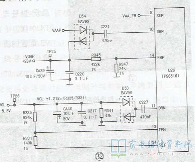 U26的10脚与C231、D54、CA39等元件组成正电压电荷泵电路。U26的10脚输出幅度约5V的方波脉冲,经过C231、D54与VAAP电压(约+16V)叠加,再经D54、CA39整流滤波后,得到约+23V的VGHP电压。U26的14脚外接vGH取样电阻R345、R347,输入的取样电压与IC内部的基准电压相比较,其误差电压用于对vGHP电压的稳压控制。