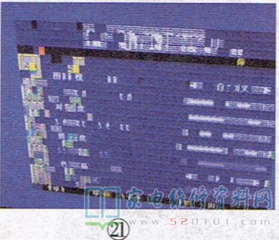 在液晶彩电中,若解码或格式变换电路工作不正常,则输出的图像信号必然异常,其典型故障现象是蓝屏正常,但图像花屏,且显示的字符为乱码,如图21所示。另外,若主芯片散热不良,在热机时也会出现花屏故障。