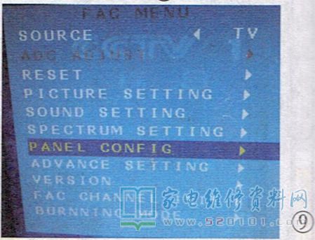 例如:一台长虹LT46729FX液晶彩电(原配友达液晶屏,型号为T460HW03),因原液晶屏破裂,换上一块46英寸的奇美液晶屏后,图像为花屏,如图8所示。在许多液晶彩电的总线中,设有“屏参"选项(英文标常为PANEL、LVDS MAP等),如图9所示,通过调整该项的值来改变上屏信号的种类,从而正常地显示图像。