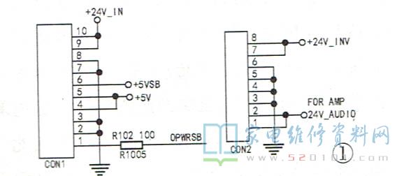 不同时期的液晶电视电源板与主板连接情况大致有以下两类:第一类是电源与主板连接有两个插座,如图1所示。CON1是电源输往主板的工作电压,以及主板送往电源板,经电源板再去背光电路的控制信号。CON2连接的是电源送往背光电路的供电+24V-IN 及主板伴音电路需要的24VAUDIO电压。由两插座传送电压的种类可以看出,此机电源分主、副电源两部分。CON1中有两路5V电压,一路是+5VSB,另一路是+5V。+5VSB是供主板控制系统工作的电压,而+5V是供主板伴音、图像通道小信号电路工作所需的电压。24V-AUDIO 是供主板伴音电路的。+5VSB电压在待机、开机时均存在,由副电源产生。5VSB在主板上经DC- DC转换成3.3VSB。5VSB 和3.3VSB作为控制系统各输出端口偏压、时钟振荡电路、复位电路、用户存储器EPROM、FLASH程序块、键控、遥控、开/待机控制、指示灯等电路供电。若5VSB电压不正常(涉及开关电源、主板),便会出现指示灯不亮,遥控或本机按键不能开机,即控制系统不工作。