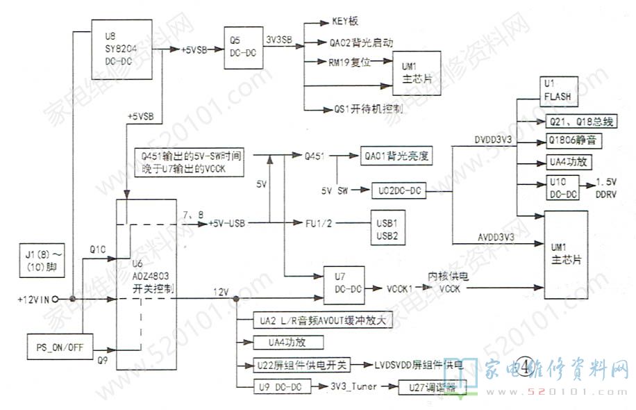 12V接入主板后,一路通过U8和Q5形成5VSB电压(作用如早期电源电路上的副电源),另一路经U6开/待机控制后,再经DC-DC转换后为主板图像及伴音电路DDR、调谐器、主芯片内核、伴音功放、屏逻辑板等供电。同时,5VSB还通过U6开/待机控制后形成5V电压,给USB设备、主芯片UM1伴音图像处理电路、DDR电路FLASH块提供工作电压。