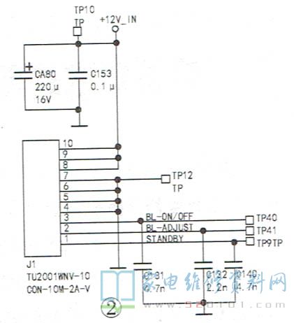 第二种主板与电源连接的方式如图2所示。这种方式在新型液晶电视中较普遍,主板与电源板连接仅有一个插座,背光电路供电直接由电源接入,不再经过主板。