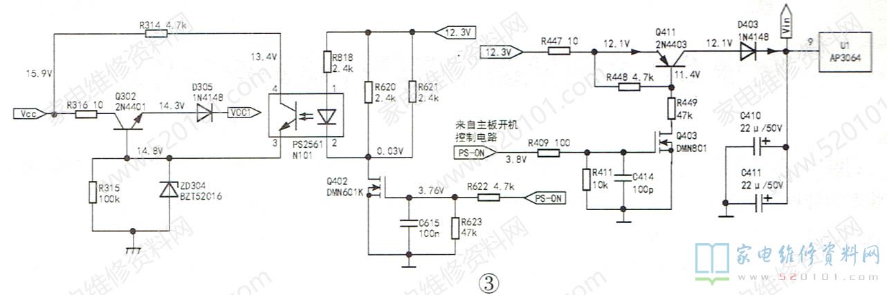主板送出的PS-ON信号(高电平)分成两路:一路送给Q402的G极,Q402导通,光耦N101工作,Q302导通,VCC通过Q302的c、e极输出vCC1电压,PFC校正块得电工作;第二路去LED背光电路,Q403导通,Q411的e-b结正偏导通,12.3V电压通过Q411、D403给U1(AP3064)供电(约11.3V)。同时,插座J1送来的背光启动与背光亮度控制信号,U1(AP3064)开始工作,自举升压输出LED灯电压,点亮LED灯。控制系统输出的开/待机控制信号的第三个作用是直接在主板上实现对图像、伴音、逻辑板供电的开/待机控制。长虹LM41iS机芯主板供电系统如图4所示。