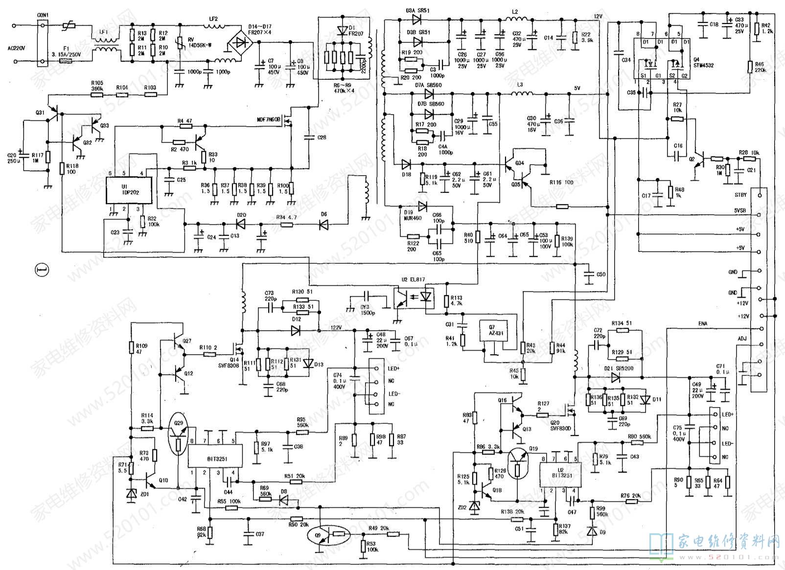 接修一台清华同方32英寸液晶电视机LE-32TL1900,故障表现为不开机,查出是开关电源板的高压侧多个元件损坏,主要是电源管理芯片IDP202击穿,场效应功率管7N60B的漏极烧断,源极5个过流检测电阻烧断开路,栅极驱动电阻烧断开路,整流桥中一个二极管击穿短路,怀疑光耦EL817也损坏。该机电源板TP072UG07-00.Gp(TP072UG07-VER 1.0)是一块通用电路板,可以用在多款清华同方32英寸LED背光液晶电视机上,有LE-32TL1600、32TL1800、LE -32TL1900、LE -32TM1000,LE -32TM1600、LE32TX1600等,淘宝上买一块要一百多元。