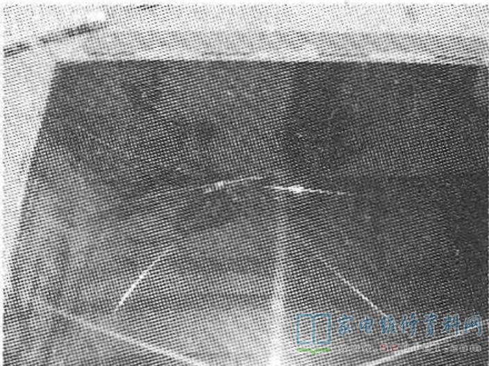图1所示液晶屏是从TCL 42英寸机上拆下的,图2则是从海信32英寸机上拆下的。这两张破裂的液晶屏有共同的特点:1.破裂的位置不是在外面,而是在内壁。需要把液晶屏拆解下来才能看清楚。不拆解而又没有开启背光的话,即使用手电筒照看也难以发现液晶屏破裂损坏。2.两张液晶屏都不是在容易受到外力挤压的中间部位破裂,而是在相对不易受挤压变形的靠边部分破裂。3.破裂形状都是以一点为中心伴有句四周的放射状裂纹。