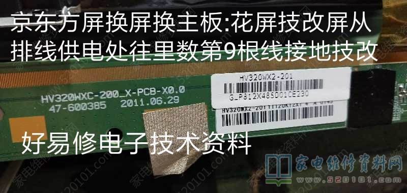 京东方屏采用HV320WXC-200边板换屏和换主板后花屏的技改方法 2023-02-05 23:02:56 阅读 2288 次 评论 0 条 摘要: 如果京东方屏(BOE)采用的边板型号是HV320WXC-200_X_PCB-X0.0换屏或者换主板后花屏的话,可以技改,从排线供电处往里数第9根线接地进行技改即可。 如果京东方屏(BOE)采用的边板型号是HV320WXC-200_X_PCB-X0.0换屏或者换主板后花屏的话,可以技改,从排线供电处往里数第9根线接地进行技改即可。 版权声明:本文为转载文章,版权归原作者所有,欢迎分享本文,转载请保留出处! 点赞 分享: PREVIOUS:山水液晶电视AEP028电源板电路原理与故障维修 NEXT:LC490EGY液晶屏有横线干扰的技改方法 文章导航