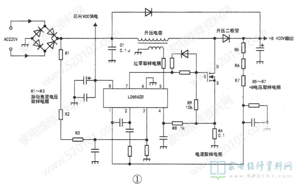4. +B输出电压(PFC电压)取样。取样信号经电阻分压接芯片①脚,当负载变化引起+B电压波动时控制开关管作出反应,以稳定+B。为了解不同型号PFC芯片启动时的输出脉冲情况,断开开关管D极,用示波器检测G极波形,发现不同芯片工作后驱动MOSFET管G极信号的分四类:G极1.为10V直流高电平, 一直保持,如L6562D;2.峰值10V,占空比约0.5的矩形脉冲,一直存在,如FAN7520、NCP1606B/1653A;3:峰值10V,占空比从小到大变化的矩形脉冲,占空比达到约0.5时一直保持,这是软启动方式,如NCP1654;4.一闪而过的一串脉冲,然后一直保持低电平。