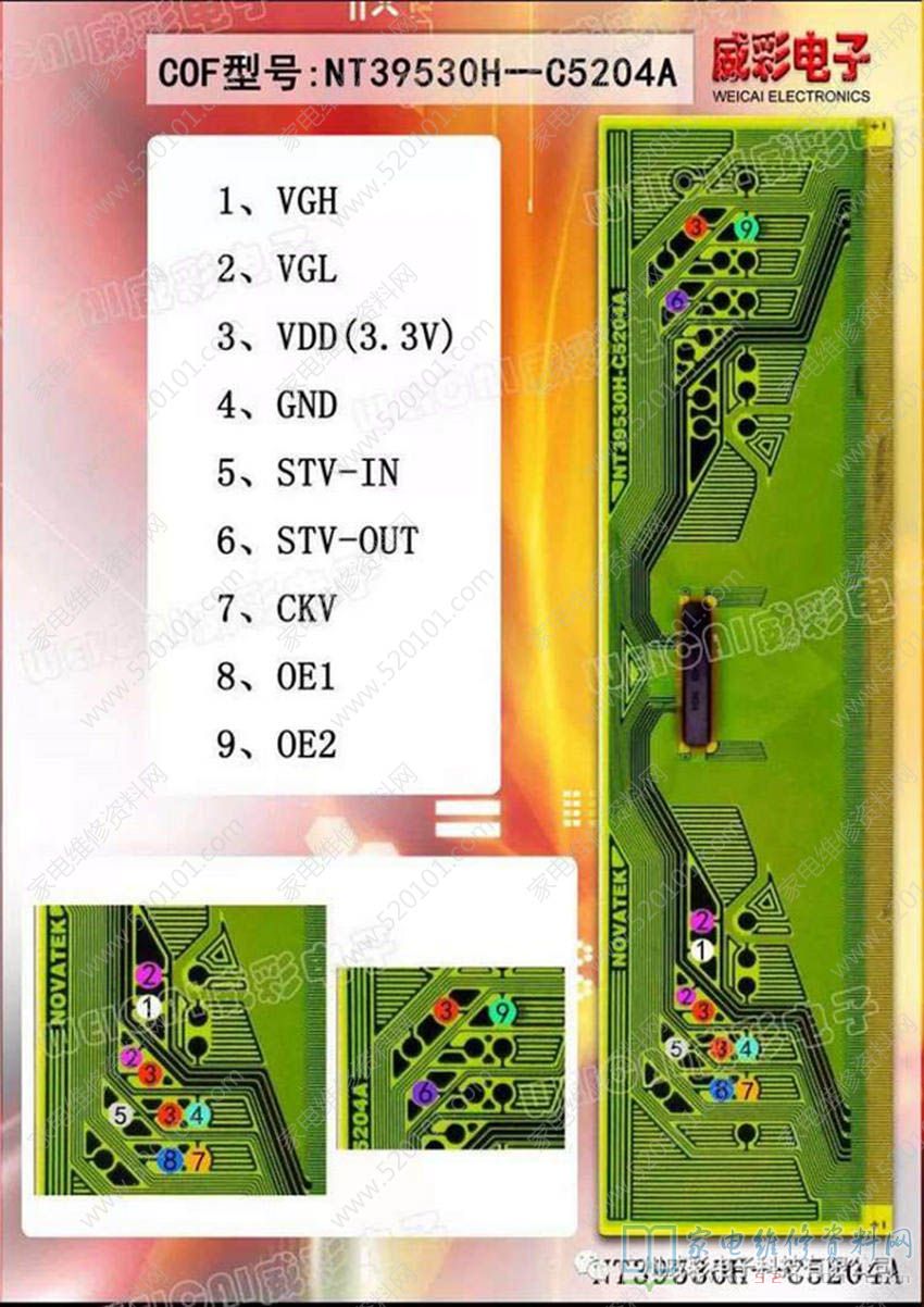 液晶COF边板NT39530H-C5204A飞线点位图 2023-02-12 22:03:32 阅读 744 次 评论 0 条 摘要: COF型号NT39530H-C5204A的VGH、VGL、VDD(3.3V)、GND、STV-IN、STV-OUT、CKV、0E1、0E2点位如下图所示。 COF型号NT39530H-C5204A的VGH、VGL、VDD(3.3V)、GND、STV-IN、STV-OUT、CKV、0E1、0E2点位如下图所示。 版权声明:本文为转载文章,版权归原作者所有,欢迎分享本文,转载请保留出处! 点赞 分享: PREVIOUS:液晶COF边板NT39530H-C5209A飞线点位图 NEXT:液晶COF边板MT3807VC飞线点位图 文章导航