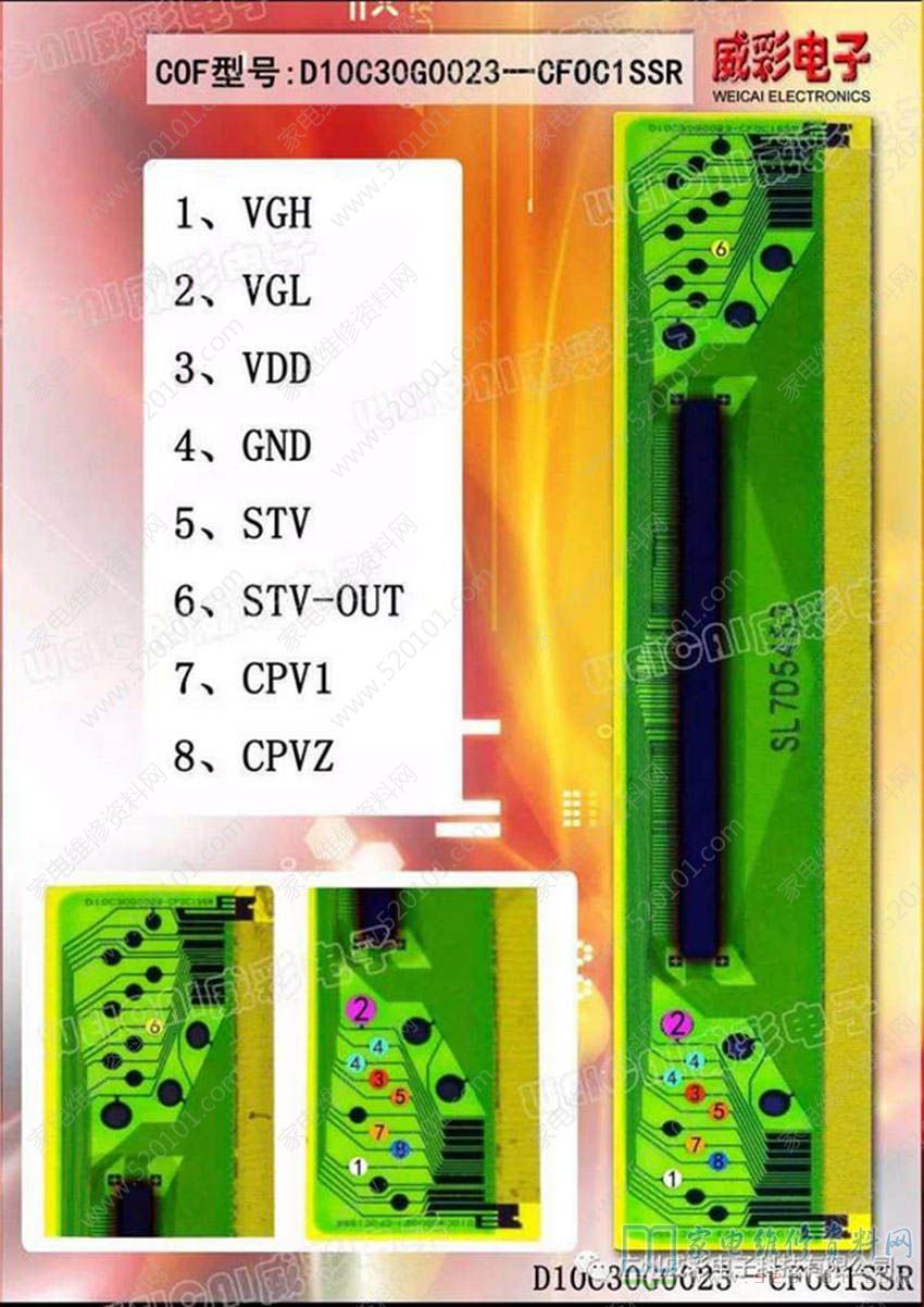 液晶COF边板D10C30G0023-CF0C1SSR飞线点位图 2023-02-12 22:14:22 阅读 948 次 评论 0 条 摘要: COF型号D10C30G0023-CF0C1SSR的VGH、VGL、VDD、GND、STV、STV-OUT、CPV1、CPV2点位如下图所示。 COF型号D10C30G0023-CF0C1SSR的VGH、VGL、VDD、GND、STV、STV-OUT、CPV1、CPV2点位如下图所示。 版权声明:本文为转载文章,版权归原作者所有,欢迎分享本文,转载请保留出处! 点赞 分享: PREVIOUS:液晶COF边板LS0306M2-C1LX飞线点位图 NEXT:海尔LE32N01液晶电视黑屏的故障维修 文章导航