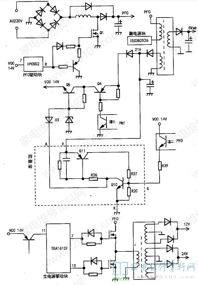 开机时,测得四脚硅的电压,阳极A为21V,阴极K为0V(接地),控制极G为0V,供电极V为21V;Q10的发射极为0V(接地),基极为0V,集电极为21V,Q10截止;Q11的发射极为21V,基极为21V,集电极为0V,Q11也是截止的,那么“四脚硅”截止。正常工作时四脚硅对电源无任何影响,如同虚设。此时热端Q5输出VCC为14V,PFC驱动块IPCS02的⑦脚有14V,PFC起振工作;主电源驱动块TEA1610T的11脚有14V电压,主电源起振,整机工作在开机状态。