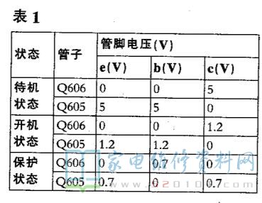 开机时,测得三脚硅的阳极A为1.2V (此处变为1.2V是因为开待机电路启动的缘故),控制极G为oV;Q605的发射极为1.2V,基极为1.2V, 集电极为ov,故Q605截止;Q606的发射极接地,基极为0V,集电极为1.2V,故Q606截止。Q605、Q606均截止,三脚硅截止,对电源也无任何影响。