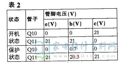 小结:1、四脚硅由一只NPN电容四只电阻组成,有四只脚,即阳极A、阴极K、控制极G、供电极V。2、当无触发电压送到G极时,四脚硅截止,对电源无任何影响;当有触发电压送到G极时,四脚硅导通,把阳极电压拉低到0V。四脚硅继续导通电压来自供电极V(21V)。四脚硅一旦导通不会截止,除非切断供电极V电压(21V),即交流关机再开。表2所示是四脚硅在开机状态,保护状态下的电压值。