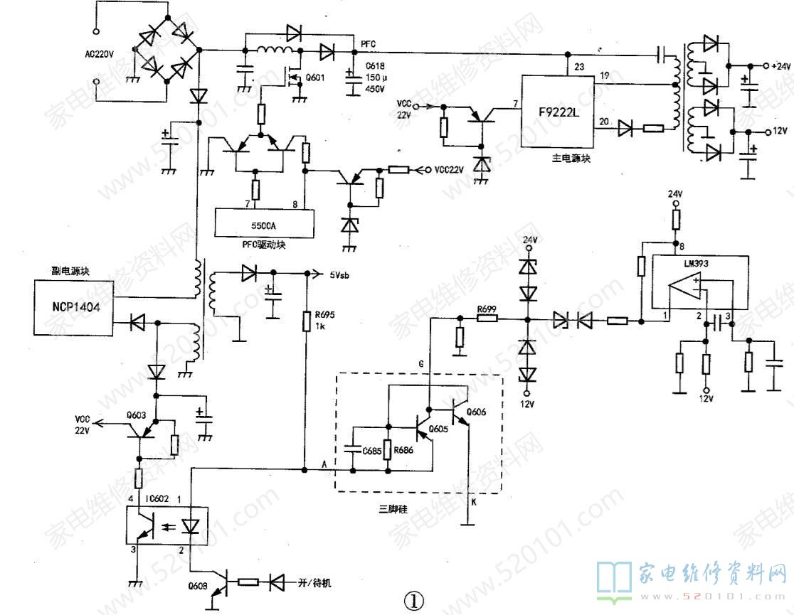 待机时,测得三脚硅的电压,阳极A为5V,控制极G为0V;Q605的发射极为5V,基极为5V,集电极为0V,故Q605截止;Q606的发射极接地,基极为0V,集电极为5V,故Q606截止。Q605.Q606 均截止,三脚硅截止对电源无任何影响,如同虚设。为什么阳极A电压为5V呢?因为待机时,开/待机控制管Q608基极电平为0V(截止),光耦IC602的①脚、②脚均为5v ,R695 无电压降,故三脚硅的阳极A为5V。同时,IC602、Q603截止,VCC为OV,PFC驱动块FA5500的⑧脚无14V电压,因此PFC停振。主电源块F9222L⑦脚无19V,主电源停振,整机处于待机状态。