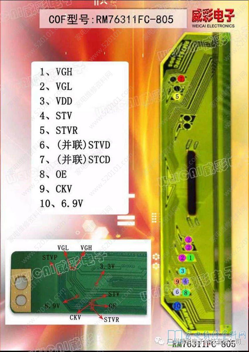 液晶COF边板RM76311FC-805飞线点位图 2023-02-20 23:03:19 阅读 1407 次 评论 0 条 摘要: COF型号RM76311FC-805的VGH、VGL、VDD、STV、STVR、(并联)STVD、(并联)STCD、0E、CKV、6.9V点位如下图所示。 COF型号RM76311FC-805的VGH、VGL、VDD、STV、STVR、(并联)STVD、(并联)STCD、0E、CKV、6.9V点位如下图所示。 版权声明:本文为转载文章,版权归原作者所有,欢迎分享本文,转载请保留出处! 点赞 1 分享: PREVIOUS:液晶COF边板RM76320FB-61A飞线点位图 NEXT:液晶COF边板SW8003K飞线点位图 文章导航