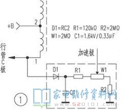 东芝C-152E5C彩电无光栅,但有伴音。 2007-01-19 01:19:15 阅读 280 次 评论 0 条 摘要: 测主电源电压正常,观察显像管灯丝亮,测得加速极电压为0V,将加速极引线焊下测其电压仍为0V,用高压探头测阳极高压及聚焦电压均正常,说明该行输出变压器内部加速极电压调整电位器中心头开路。考虑到该行变除加速极外各组电压 测主电源电压正常,观察显像管灯丝亮,测得加速极电压为0V,将加速极引线焊下测其电压仍为0V,用高压探头测阳极高压及聚焦电压均正常,说明该行输出变压器内部加速极电压调整电位器中心头开路。考虑到该行变除加速极外各组电压均正常,为了减少用户的经济损失,所以采用补救法修复。具体方法及有关元件参数见图1,调整图中W1,使屏幕亮度适中即可。 版权声明:本文为转载文章,版权归原作者所有,欢迎分享本文,转载请保留出处! 点赞 分享: PREVIOUS:东芝2950XHC图像弱,伴音有噪声。 NEXT:东芝2938XP主画面彩色图像及伴音均正常,但打开子画面后只能出现绿色的子画面窗口,无法显示图像。遥控器操作时可改变子画面窗口在屏幕的显示位置,按下主子画面转换键时仍只有主画面,子画面呈绿底色 文章导航