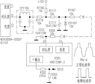 日立CMT2518T彩电,图像灰暗不清,仅有模糊的彩色图像,调整亮度和色度控制有作用,但调整对比度控制无任何变化。 2007-06-19 00:22:35 阅读 246 次 评论 0 条 摘要: 检查CPU(IC1101)发现CPU{12}脚电压始终偏低。查该脚的外围元件CP1106、C1111、ZD1107,发现稳压管ZD1107的反向电阻值仅为3kΩ左右。更换ZD1107后,IC1101{12}脚电压在 检查CPU(IC1101)发现CPU{12}脚电压始终偏低。查该脚的外围元件CP1106、C1111、ZD1107,发现稳压管ZD1107的反向电阻值仅为3kΩ左右。更换ZD1107后,IC1101{12}脚电压在0~10V之间可调,故障排除。 版权声明:本文为转载文章,版权归原作者所有,欢迎分享本文,转载请保留出处! 点赞 分享: PREVIOUS:日立2518的彩电开机后要等三分钟才出现声音和图象,图象场同步不稳定,有线性失真和无彩色 NEXT:日立CM2988彩电有像无声,AV输入正常 文章导航