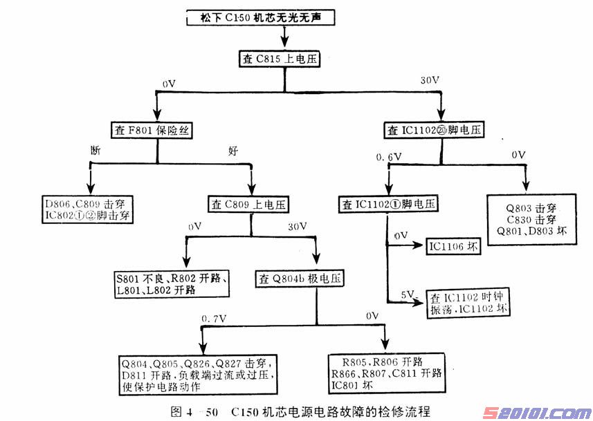 该故障说明IC802能工作,一般是遥控关机电路出现故障引起。多是遥控控制电路不能输出开机指令所致,可测Q802集电极电压,如果为5.6V,说明遥控系统输出正常的开机指令。如为0V,说明遥控系统已对电源输出了关机指令,可进一步测Q803基极电压,正常时开机状态应为0.1V低电平。如正常,继续检查Q803、Q802;如异常,则检查微处理器IC1101的工作条件电路及其本身。具体可测IC1102(29)脚的电压,若(29)脚电压为0.6V,则说明IC1102有问题,应接着检查IC1102(29)脚的供电电压以及时钟脉冲振荡是否正常。若IC1102(29)脚的电压为0V,则说明IC1102电路正常。应接着检查Q803是否击穿、C830是否击穿等。 [Page]